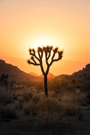 Joshua Tree National Park, California. This is one of my personal favorite photos I've taken in Joshua Tree. Taken in 2021 - this is a photo that really makes me feel the spirit of the desert. The orange glow of the sun getting ready to set behind the mountains leaving this Joshua Tree silhouetted in the middle of the rock formations - showing the true depth of the desert.