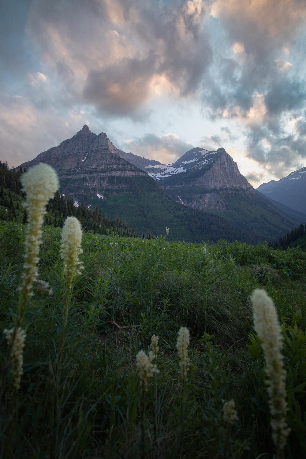 Glacier National Park, Montana. Just off Going-to-the Sun Road sits a big field full of flowers, bear grass, and the best view of Mt Oberlin. It was an evening where I set up my camera on a tripod, took a few photos, and sat in awe of the beauty that was all around me.